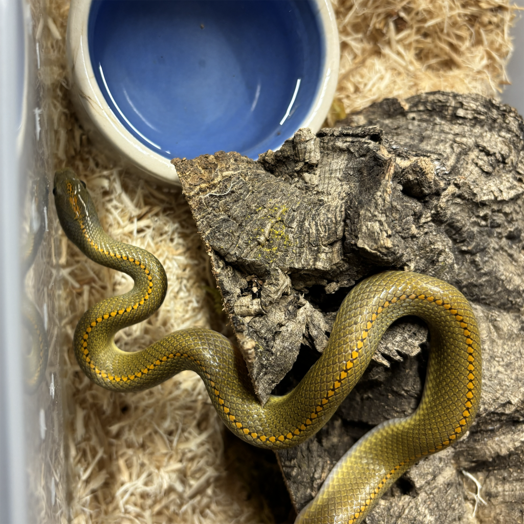 I really like little snakes, and House Snakes are among my favorites. I first saw live Aurora snakes in 1995 at the Mid-Atlantic Reptile Show (MARS) and fell in love with them. A couple of years after that I began to work exclusively with Green Tree Pythons (Morelia viridis), and moved away from colubrid snakes. Since rekindling my early affection for colubrids I’ve kept my eye out for Auroras. To my great delight I was able to obtain a young adult male in 2025 at Colubridfest, an all-colubrid symposium and show held in Fort Wayne, Indiana that year.