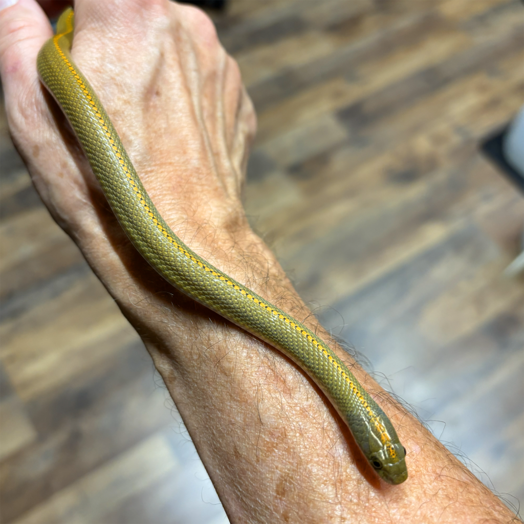 These beautiful snakes are quite spectacular as hatchlings, having each scale tipped in yellow and giving a very speckled appearance. The orange dorsal stripe is evident and is retained into adulthood, even as the speckled appearance gives way to a solid moss-green adult. I’ll be on the lookout for more of these and hope to establish a little breeding group. But even having one in the collection is a joy!